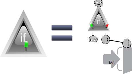 Das IfElse-Snippet kann von beliebig vielen Snippets am oberen Ende erreicht werden. Es hat zwei Ausgänge: einen grünen und einen roten. Im IfElse-Snippet wird eine Bedingung hinterlegt. Ist sie erfüllt, geht das Programm am grünen Ausgang weiter, sonst läuft es am roten weiter.